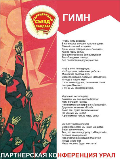 На этот раз партнерская конференция Landata была стилизована под "Партийный съезд Landata" и проходила с красноармейской атрибутикой, буденовками, духом партийного единства и гимном собственного сочинения. Участникам конференции были предложены интересные доклады по сетевым решениям Allied Telesyn, решениям Powerware по защите электропитания, оборудованию Avocent, новейшим продуктам Lenovo и структурированным кабельным системам RIT. Особое внимание на конференции уделялось продукции IBM - слушателям был представлен обзор по системам хранения данных IBM Total Storage, серверным решениям IBM eServer xSeries и pSeries и программам поддержки партнеров IBM. После окончания презентаций менеджеры компании Landata и приглашенные представители компаний-вендоров в рамках круглого стола ответили на все вопросы партнеров, поделились с ними актуальной информацией по заинтересовавшим их продуктам и более подробно остановились на программах поддержки партнеров. После окончания деловой части конференции участники РПК разбились по командам и, сплотившись плечом к плечу, решали всевозможные творческие задачи: лепили из пластилина памятники ландатре, строили живую пирамиду, писали стихи и рисовали плакаты своих компаний-команд в духе абстракционизма. На следующий день участникам конференции также выпал шанс посоревноваться в меткой стельбе из ружей и в скачках на лошадях. Особо отличившиеся члены партий получили почетные грамоты и удостоились рукопожатия верховного главнокомандующего. | ||||||||||||